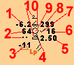 Erklärung 1=Temperatur 2=relative Luftfeuchtigkeit und aktuelles Wetter, hier Regen 3=Taupunkt 4=Windrichtung und -Stärke 5=Regenmenge 6=Luftdruckdifferens der letzten drei Stunden in hPa 7=Luftdruckverlauf letzten drei Stunden 8=Luftdruck über NN in hPa 9=Kreis für Himmelsbedeckung 10=Wolkenarten mit Hohen Wolken wie Cirrus, Mittelhohen Wolken, hier Altocumulus stratiformis duplicatus, tiefe Wolken, hier Cumulus mediocris |